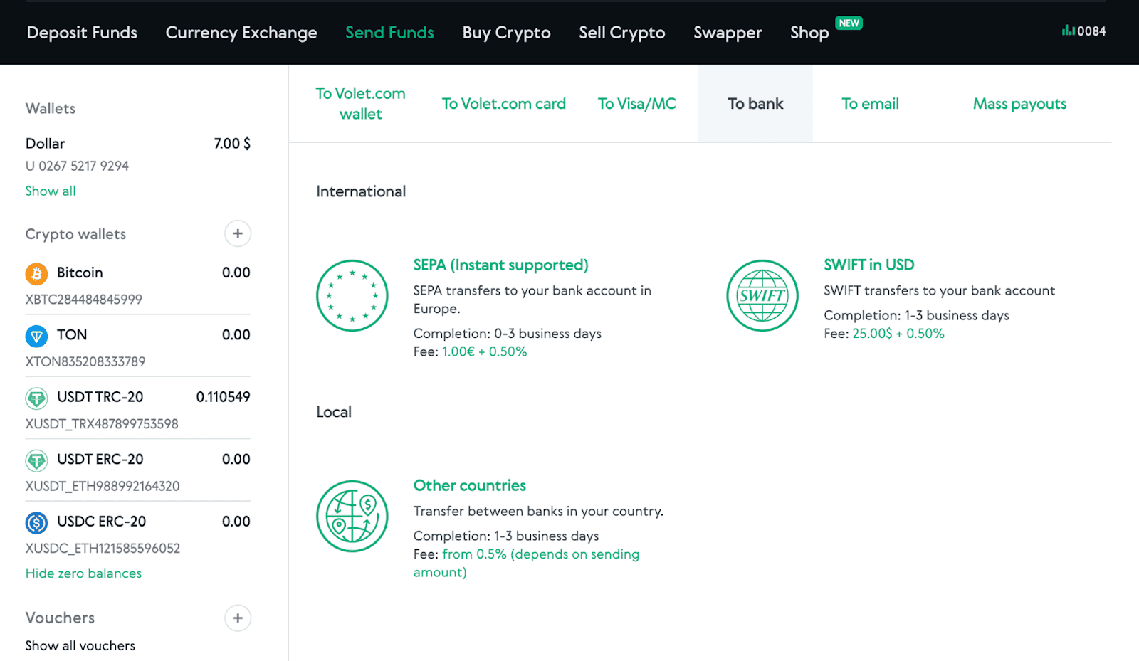 Bigger amounts, don’t mind waiting a bit? Try bank transfers, local or SWIFT. Or SEPA, if you are in Europe. Move money from Volet.com to your traditional bank.