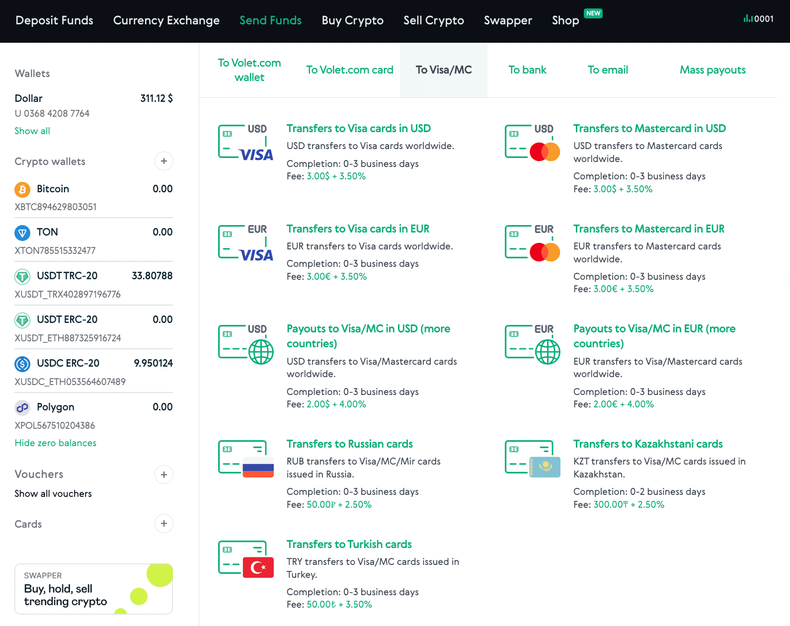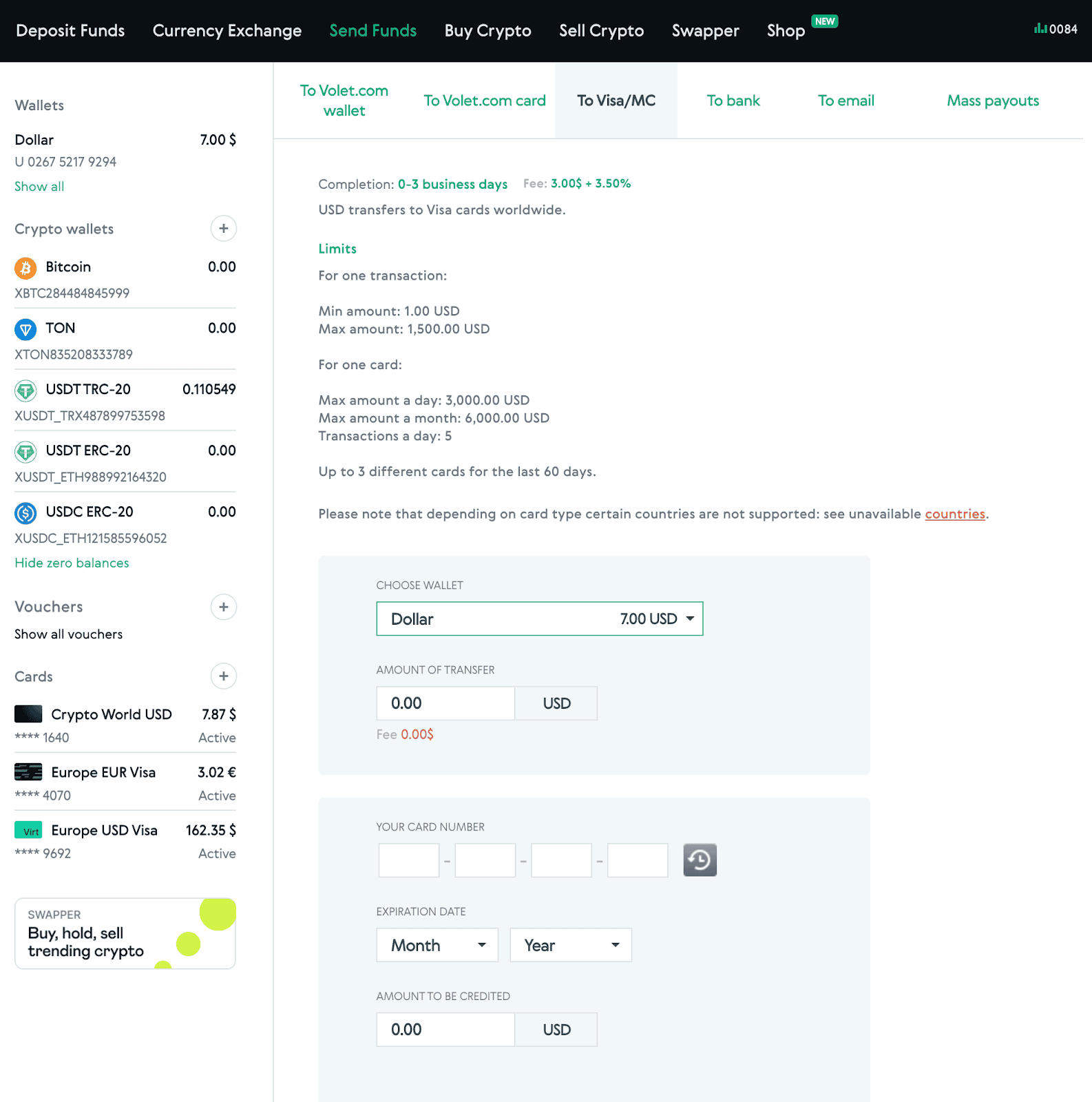 In Volet.com, go to Send Funds and then choose To Visa/MC.