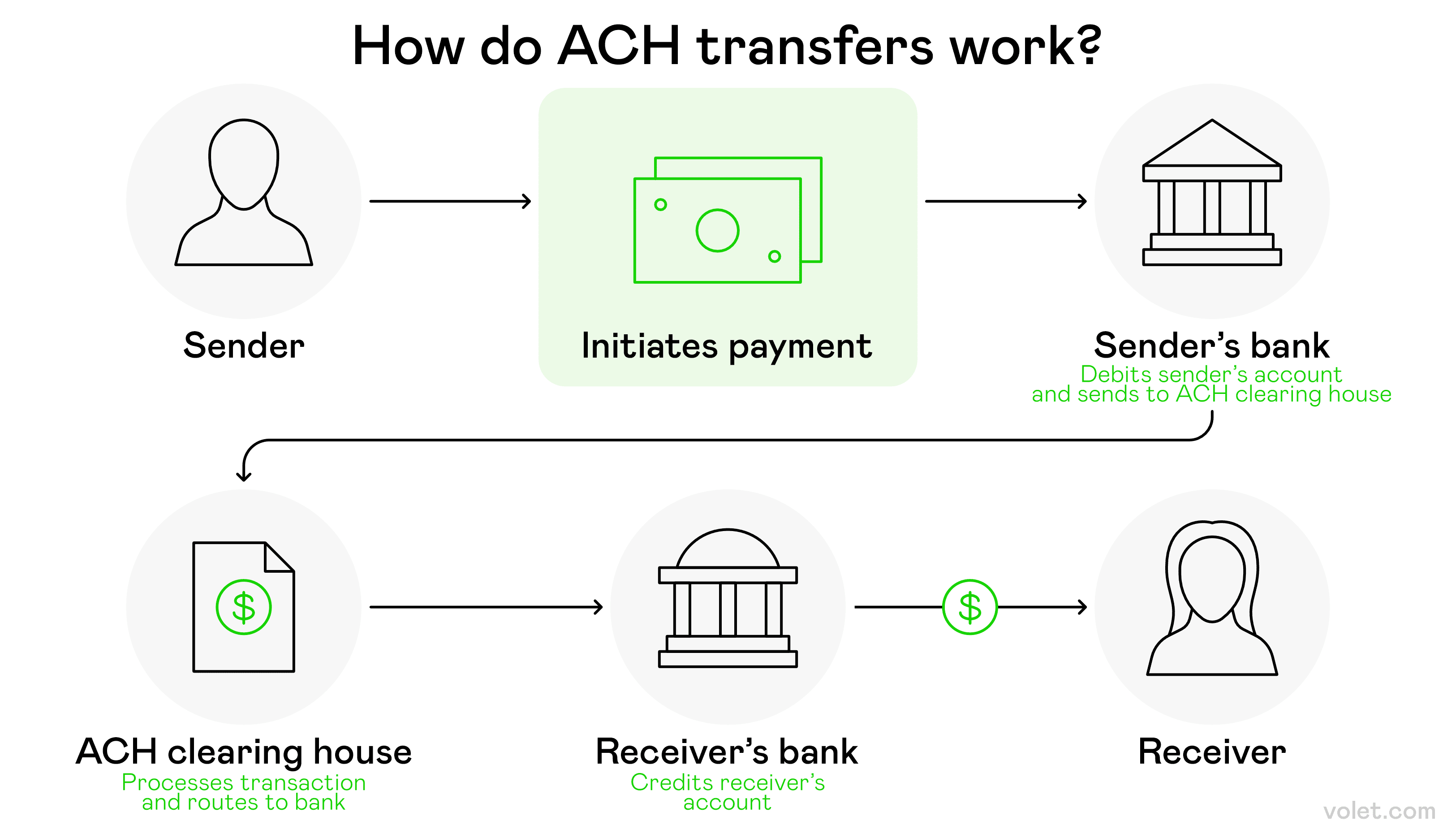 So werden bei ACH-Überweisungen Gelder über Banken und das ACH-Netzwerk vom Absender zum Empfänger transferiert.
